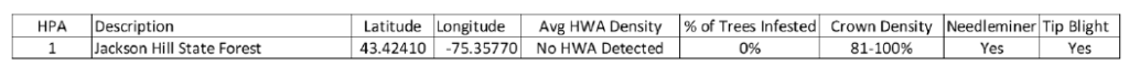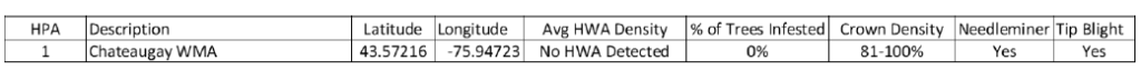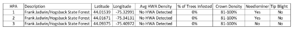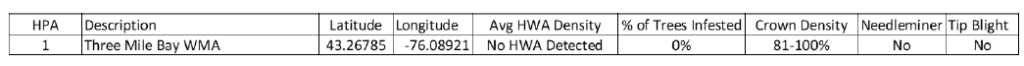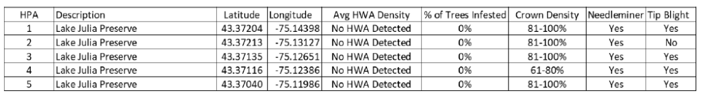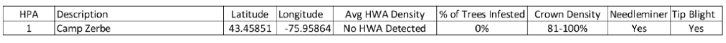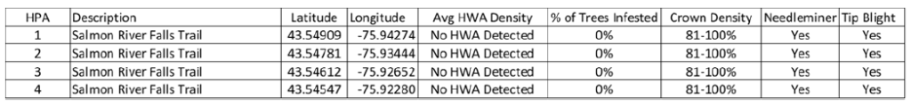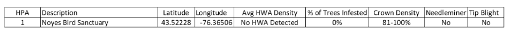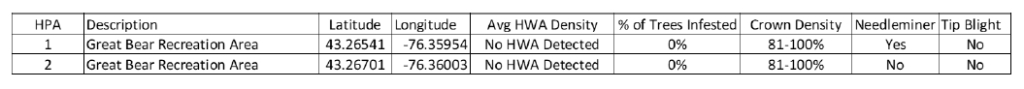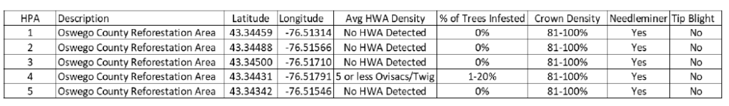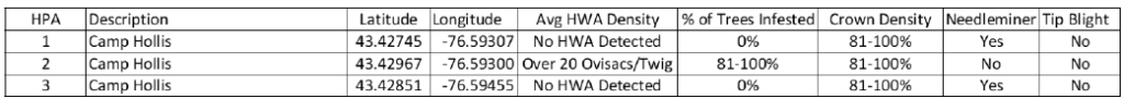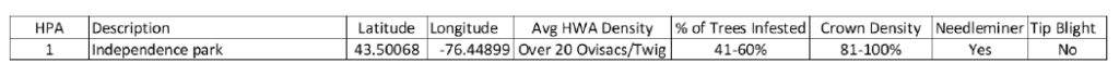 The following tables of the PCAs include the location of each HPA, average HWA density, % of trees infested, crown density, and whether hemlock needleminer (Coleotechnites spp.) or tip blight (Sirrococcus tsugae) was found on these trees. The tables indicate that HWA was found at three of these sites (Independence Park, Camp Hollis, and Oswego County Reforestation Area). Landowners/managers have no obligation to treat this insect, but we encourage treatment for two reasons; 1) to protect the land managers investments by supporting tree stand health, integrity and resiliency to other forest pests and pathogens and 2) to reduce the rate of spread of HWA into other parts of our region. All data was recorded using iMap3 Forest Pest Data Collection Tool.