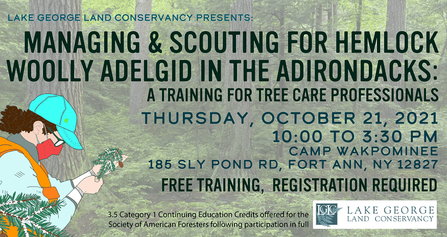 Join our partners at the Adirondack Invasive Plant Program (APIPP PRISM) to learn how hemlock trees play a key role in maintaining watershed and habitat health; how and when to correctly scout for HWA in the field; the state of research currently underway to develop biological controls; chemical control options, application methods, and treatment prioritization strategies in use by the NYS Department of Environmental Conservation; best methods for preventing HWA spread after coming in contact with infestations; ask questions from top experts and gain hands-on experience with HWA in the field.