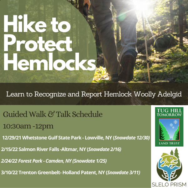 Join a series of guided walk and talks to learn to recognize and report hemlock woolly adelgid HWA- an invasive insect that kills hemlock trees. Hemlocks are an important tree species that provide many benefits for people and nature. Detecting the presence of HWA early on provides enough time to protect infested trees and helps to stop the spread to new areas. To help raise awareness, and encourage community members to get involved, a series of guided hikes will be held each month beginning in December through March. Participants will learn how to survey for HWA and report observations using their smartphone through a free mobile application called iMapInvasives-a community science tool.