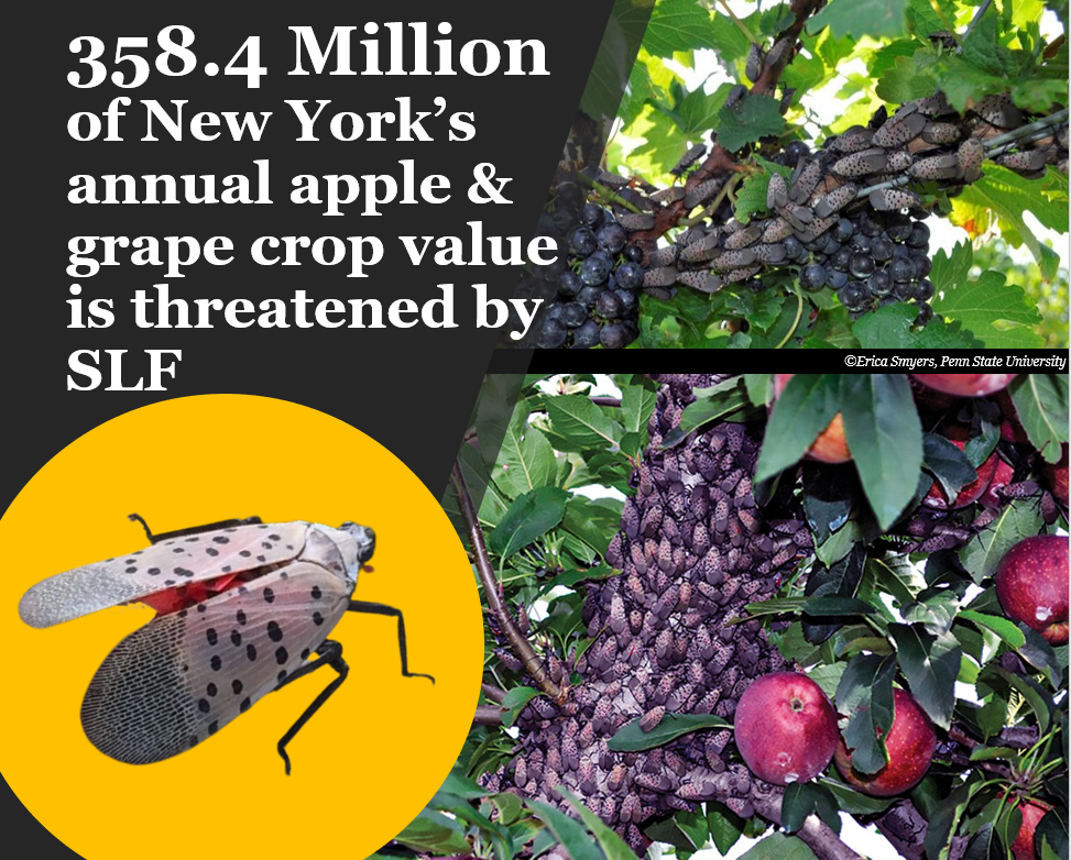 SLF feeds on upwards of 70 species of host plants. Of more concern to us at the New York State Department of Agriculture and Markets (AGM) are grapes, apples, and hops, which are each economically significant crops for the agricultural industry in New York and across the nation. Being that New York is the second-largest apple producer and third-largest grape producer in the US the state stands to lose $358.4 million in annual crop yields (DEC ). SLF additionally feeds on forest species that are important to New York farmers such as maple and walnut trees.
