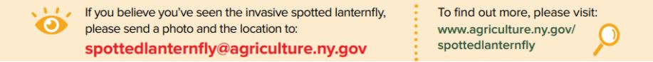 - Email pictures and location to spottedlanternfly@agriculture.ny.gov OR fill out the form at Spotted Lanternfly Observation, which includes specimen information.