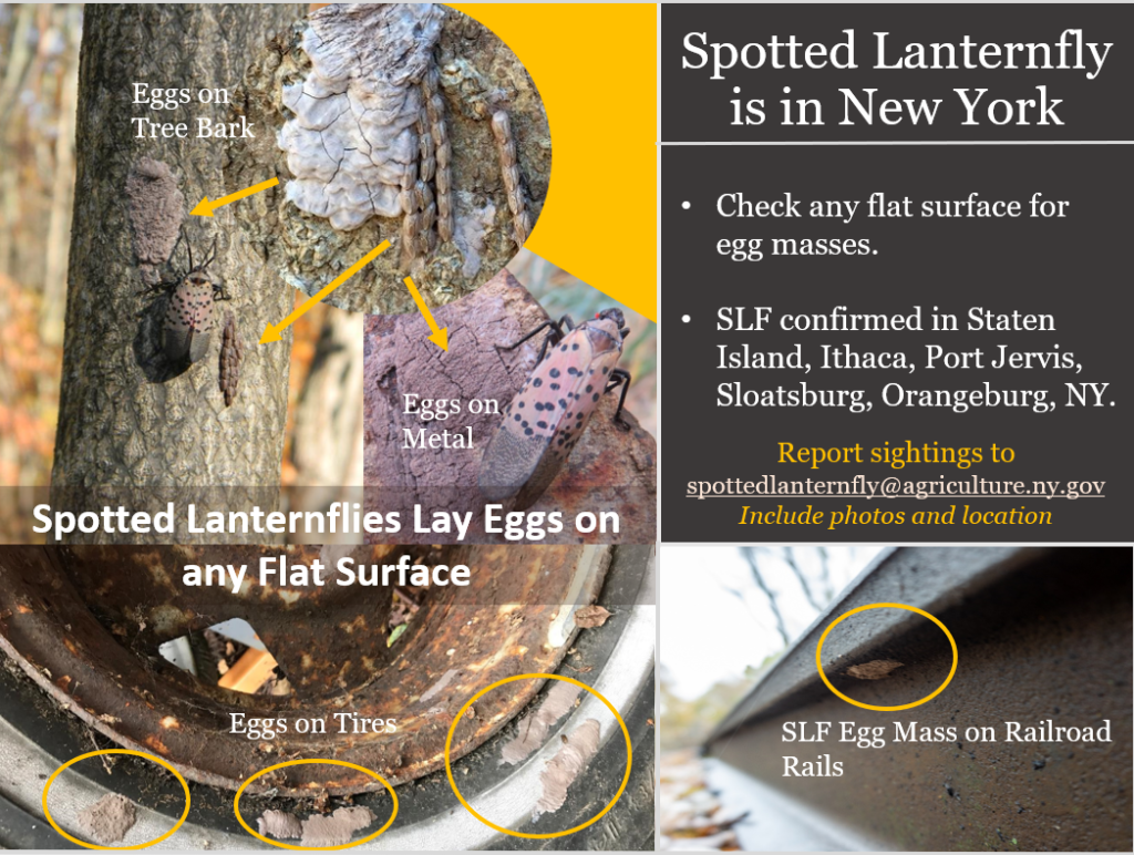This finding adds to the growing list of areas in which the presence of SLF has been confirmed in New York this year. Live infestations have been confirmed in the following NY counties: Richmond, Rockland, Orange, Fairfield, and Tompkins. The counties of Suffolk, Nassau, Kings, Queens, New York, and Westchester have confirmed findings of individual SLF adults but no infestations. A specimen from the Bronx has been submitted for confirmation.