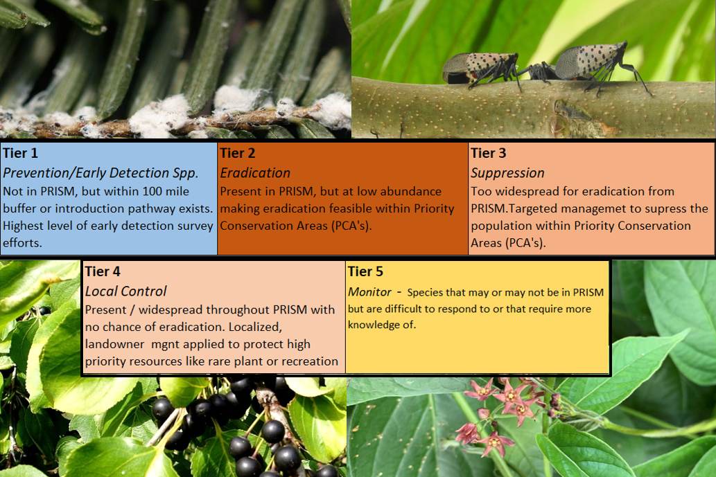 Tier 1 species are not known to be present within the region but are within a 100 mile radius or a pathway exists for their introduction.  Hemlock woolly adelgid and spotted lanternfly are examples of Tier 1 species.  For these species, prevention is the best management strategy to implement. SLELO’s early detection team, Robert Smith and Brittney Rogers put Tier 1 species in the forefront of their surveillance efforts. SLELO has also recruited and trained volunteers to recognize and report priority prevention species within this Tier though our Volunteer Surveillance Network.